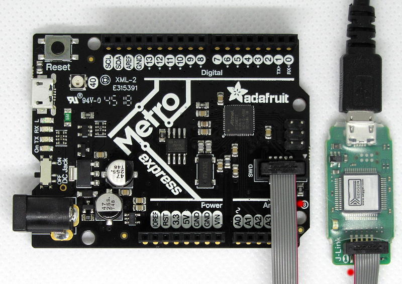 The ATSAMD21G18 microcontroller on a Adafruit Metro M0 Express Arduino compatible board can be directly programmed and debugged by plugging a SEGGER J-Link EDU Mini JTAG/SWD debugger into the SWD header of the target board. With a J-Link connected to the board, it can be programmed and debugged using Atmel Studio or other programming tools. This article shows the SEGGER J-Link EDU Mini to Metro M0 Express connection using SWD (Serial Wire Debug).