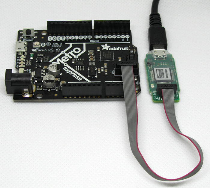 The following image shows how to connect a J-Link EDU mini debugger to an Adafruit Metro M0 Express board using the SWD header connector. The red wire of the J-Link ribbon cable must line up with pin 1 of the SWD header. Pin 1 is highlighted in the previous image.