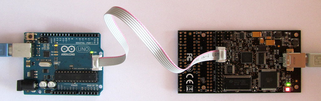 Use a 6-way ribbon cable with two 6-pin (3 by 2) female IDC connectors to connect from the ISP connector on the AVR Dragon to the ICSP header of the Arduino Uno. Pin 1 on the AVR Dragon ISP header is marked with a "1". Pin 1 on the Arduino Uno is marked with a small dot. Images below show the header markings in more detail.