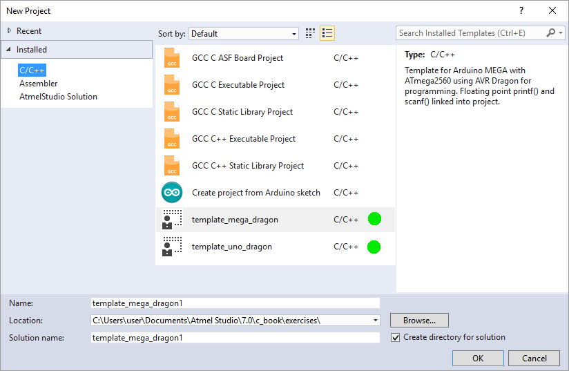 Section 1.3 on page 26 of C Programming with Arduino describes the installation of template files. These template files are used in Atmel Studio 7 when following the code examples in the book. This article explains step by step how to install the template files for the Arduino Uno and Arduino MEGA in Atmel Studio 7.