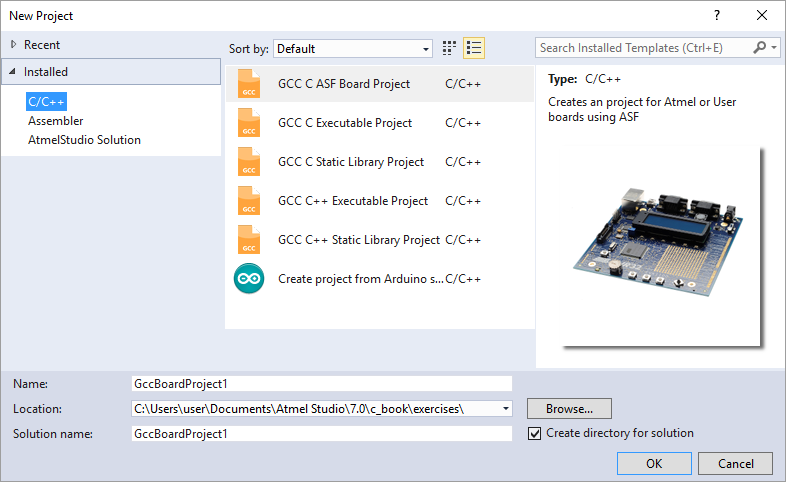 When a new project is started in Atmel Studio 7, the default New Project dialog box looks as follows.
