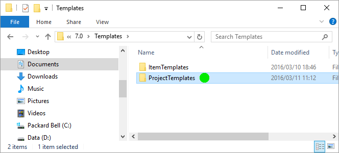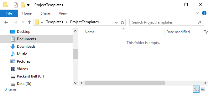 The ProjectTemplates folder is where the template files will be copied to. Leave this folder open in the Windows File Explorer.