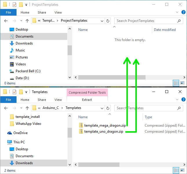 Finally copy the two template files from the Templates folder to the ProjectTemplates folder that you opened in the first instance of file explorer. The copying can be done by dragging and dropping the files.