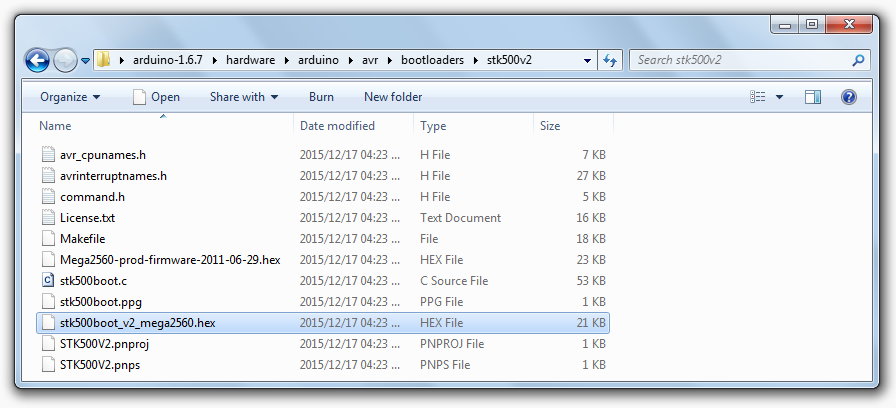 For example, in Arduino IDE version 1.6.7, the hex file is found in arduino-1.6.7\hardware\arduino\avr\bootloaders\stk500v2\ as shown in the image below. This is just to show the location of the file – we will need to navigate to this file from within Atmel Studio.