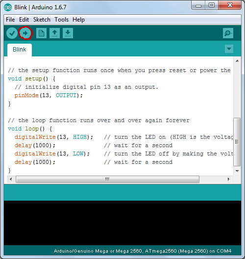 Open the Blink example sketch from the top menu under File → Examples → 01.Basics → Blink. Load the Blink sketch to the Arduino MEGA 2560 from the Arduino IDE using the Upload button on the Arduino IDE toolbar.