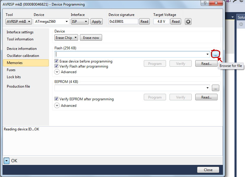 Click Memories in the left pane of the Device Programming dialog box. Click the [...] button found at the right of the box under the Flash label to browse for the bootloader file.