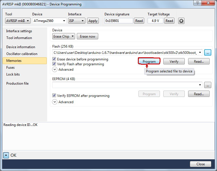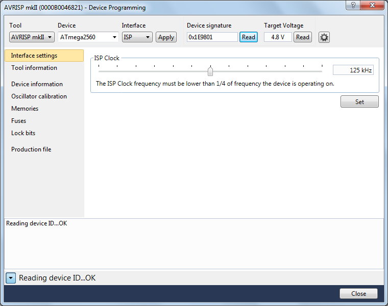 In the Device Programming dialog box, select the Tool (AVRISP mkII or AVR Dragon), Device (ATmega2560) and Interface (ISP) then the click the Apply button. To test that Atmel Studio can communicate with the AVR on the Arduino board, click the Read button under the Device signature heading.