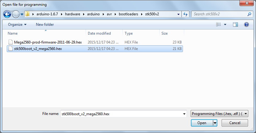 Navigate to and select the hexadecimal bootloader file called stk500boot_v2_mega2560.hex found in the Arduino IDE software sub-folder hardware\arduino\avr\bootloaders\stk500v2. Click the file in the dialog box and then click the Open button as shown in the image below.